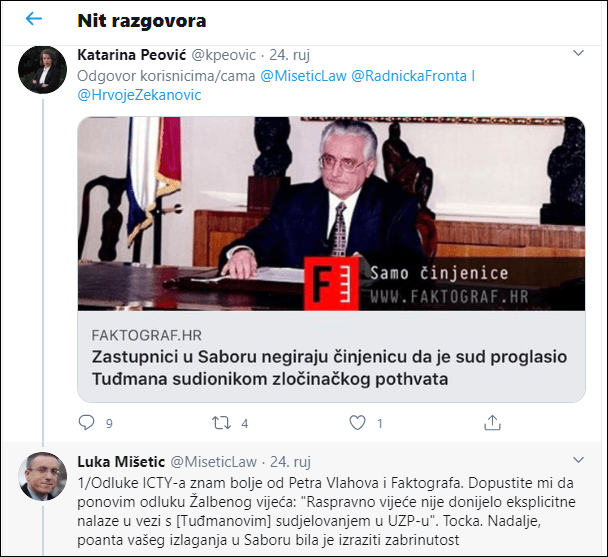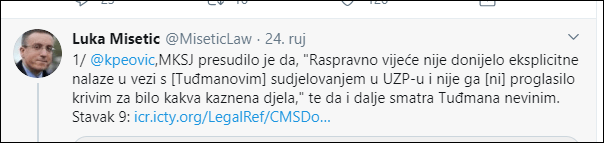 Ali ni to nije bilo dovoljno, pa Faktograf i dalje inzistira na tvrdnji da bi se dr. Franji Tuđmanu sudilo , ali eto prerano je umro, pa nisu stigli podignuti optužnicu. I to je Luka Mišetić demantirao, pa je sve postalo još jedan jalov pokušaj proglasiti Hrvatsku kao rezultat udruženog zločinačkog pothvata .