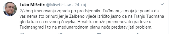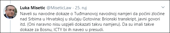 Na njenu izjavu reagirao je na Twitteru odvjetnik pri Haškom sudu Luka Mišetić i ustvrdio da ničim nije dokazano sudjelovanje dr.Franje Tuđmana u udruženom zločinačkom pothvatu.