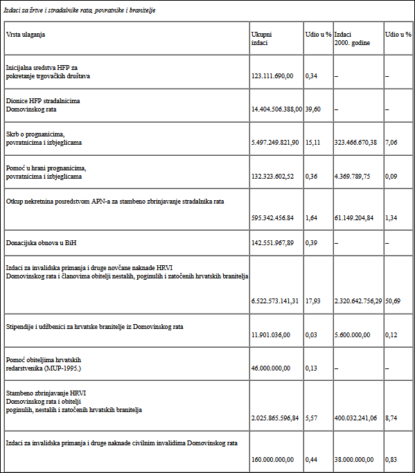 Vidljivo je, dakle, da je 36,373 milijarde kuna ili 61,64% od ukupnih sredstava potrošeno na zbrinjavanje prognanika, izbjeglica i povratnika. Ostalo su bili izdaci za obnovu stambenih objekata, infrastrukture, javnih poduzeća i razminiranje.