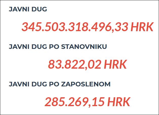 Javni dug iznosi kako se vidi iz priložene tablice više od dvogodišnjeg Proračuna RH, točno u omjeru od 2, 345 godišnjeg Proračuna RH.