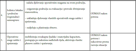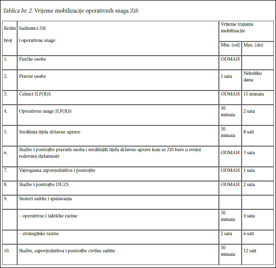 Nakon zaprimanja obavijesti o izvanrednom događaju mobiliziranje određenih dijelova operativnih snaga važnih za pravovremeno reagiranje provodi se prema tablici;