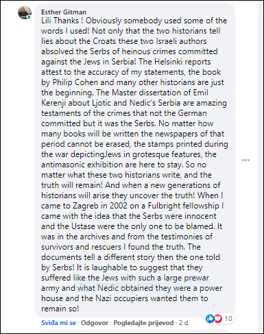“Lili hvala! Očito je netko koristio neke riječi koje sam ja koristila. Ne samo da dva povjesničara lažu o Hrvatima , ova dva izraelska autora oslobodila su Srbe gnusnih zločina počinjenih nad Židovima u Srbiji! Helsinki se javlja na potvrdu točnosti mojih izjava, knjiga Philipa Cohena i mnogih drugih povjesničara tek je početak. Majstorska disertacija Emil Kerenji o Ljotiću i Nedićevoj Srbiji je čudesno istraživanje zločina koje nisu počinili Nijemci nego Srbi. Bez obzira na to koliko će knjiga biti napisano novine tog razdoblja ne mogu se izbrisati, pečat ispisan tijekom rata koji prikazuju Židove u grotesknim karakteristikama, antimasonska izložba su tu, da ostanu. Dakle, bez obzira što ova dva povjesničara pišu, istina će ostati! I kada će nove generacije povjesničara ustati otkrivati će istinu! Kada sam 2002. godine došla u Zagreb na Fulbrightovom zajedništvu imala sam ideju da su Srbi nevini, a ustaše da su jedini krivi. U arhivama i iz svjedočanstava preživjelih i spasioca otkrila sam istinu. Dokumenti pričaju drugu priču a ne onu koju Srbi pričaju. Smiješno je sugerirati da su patili poput Židova s tako velikom predratnom vojskom i ono što je Nedić dobio bili su moćnici i Naci okupatori, koji su htjeli da takvi i ostanu.”
