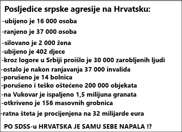 Stoga moram vas i one zastupnike u Saboru koji su vam pljeskali podsjetiti opet i ne znam po koji put iznova na početak i slijed planirane srpske agresije na Hrvatsku.
