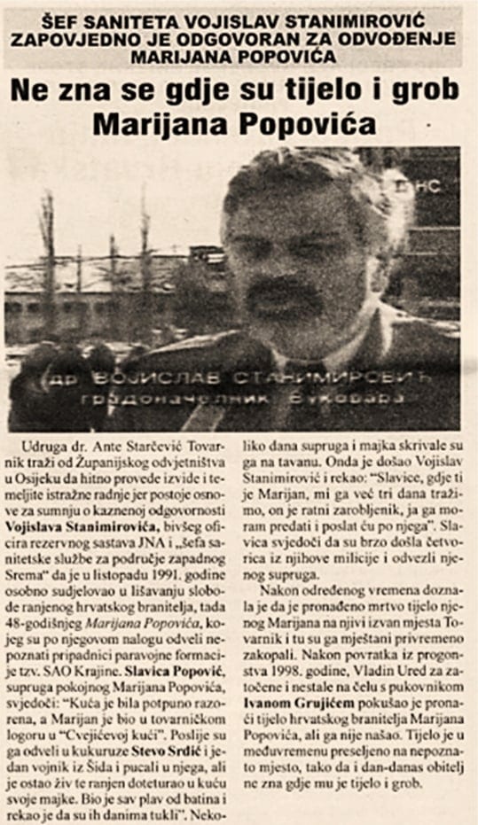 Protiv Vojislava Stanimirovića, svjedočila je Slavica Popović iz Tovarnika, da je dr. Stanimirović odveo njenog supruga kojemu se nakon toga, do dana današnjeg gubi svaki trag. Novinarka Karolina Vidović Krišto i povjesničar Josip Jurčević podnijeli su Županijskom državnom odvjetništvu u Osijeku 2013. godine kaznenu prijavu zbog kaznenih djela protiv čovječnosti i međunarodnog prava, a slučaj je preuzeo zagrebački odvjetnik Zvonimir Hodak.