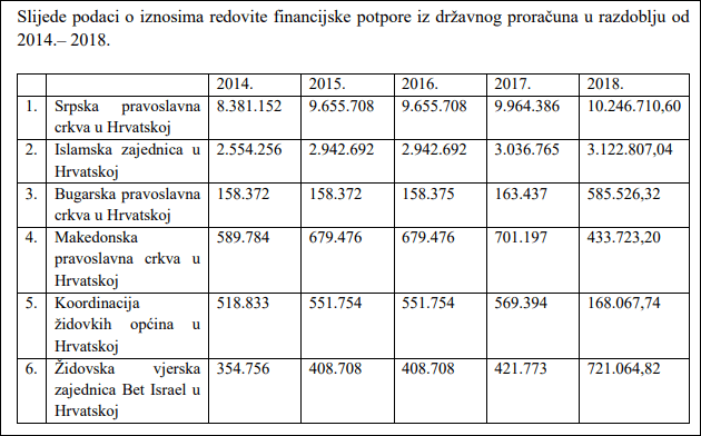 “Prema Ustavu Republike Hrvatske (čl. 41. Ustava) sve vjerska zajednice jednake su pred zakonom i odvojene od države. Vjerske zajednice slobodne su, u skladu sa Zakonom, javno obavljati vjerske obrede, osnivati škole, učilišta, druge zavode, socijalne i dobrotvorne ustanove te upravljati njima, a u svojoj djelatnosti uživaju zaštitu i pomoć države.