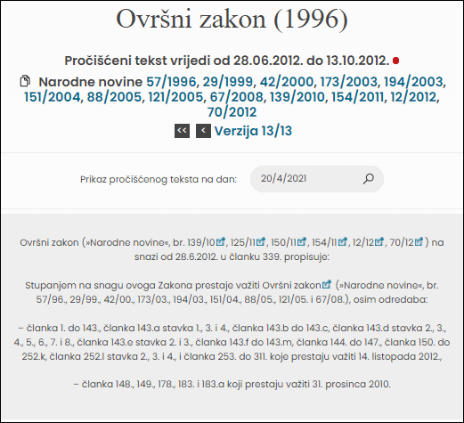 Prvi Ovršni zakon donijela je Vlada HDZ-a 28.06.1996.godine, objavljen: 12.07.1996. godine, stupa na snagu: 11.08.1996.godine. Time prestaje važiti Zakon o izvršnom postupku iz 1978.godine.Ovaj Ovršni zakon prestaje važiti: 14.10.2012.