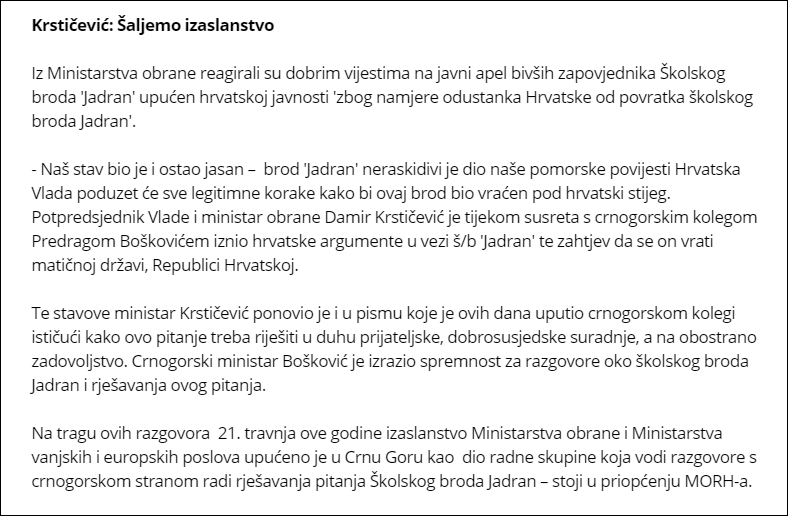 “Brod ‘Jadran’ je vlasništvo države Crne Gore, odnosno njene mornarice. Tačno je da je Hrvatska iskazala interesovanje za tim brodom. Oni smatraju da je on vlasništvo države Hrvatske. Mi, međutim imamo svoje argumente. Sigurno je da nećemo dozvoliti da taj brod ili bilo što drugo bude prepreka za dobrosusjedske odnose sa Hrvatskom ili nekom drugom zemljom.”