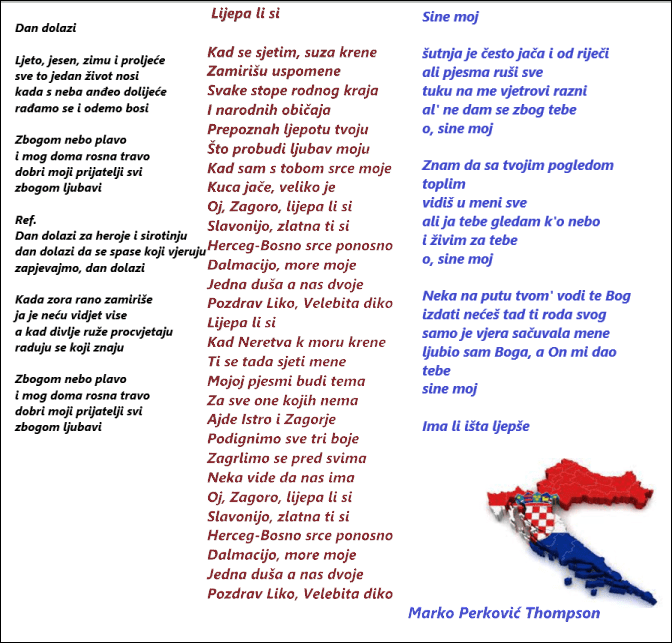 Moja prva pjesma Bojna Čavoglave nastala je 1991. Napisao sam je ovdje u selu i započinje s pokličem “Za dom spremni”. Ta se pjesma četiri godine puštala po tisuću puta dnevno na svim TV i radio postajama u Hrvatskoj i BiH i nitko nikada nije postavio pitanje je li početak sa “Za Dom spremni” dobar ili loš.