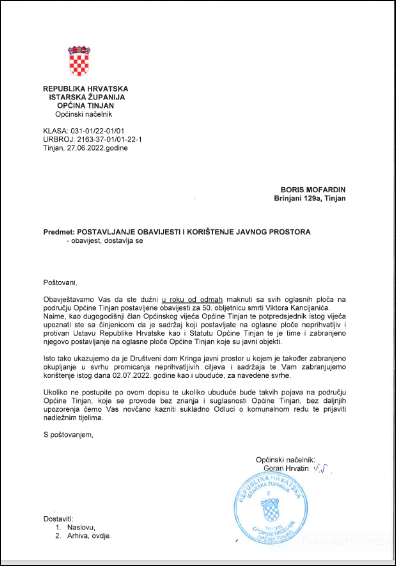„Ukoliko ne postupite po ovom dopisu te ukoliko ubuduće bude takvih pojava na području Općine Tinjan, koje se provode bez znanja i suglasnosti Općine Tinjan, bez daljnjih upozorenja ćemo Vas novčano kazniti sukladno Odluci o komunalnom redu te prijaviti nadležnim tijelima“