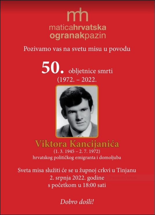 2.srpnja 2022.godine 50 je obljetnica smrti Viktora Kancijanića, istarskog sina, hrvatskog rodoljuba i mučenika koji je ubijen kao član Bugojanske skupine 2.srpnja 1972.godine, negdje podno planine Raduše u BIH.