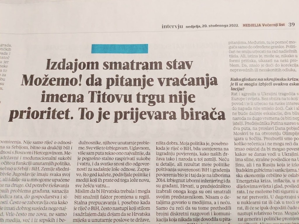 Kako je Maršal J.B. Tito bio predsjednik Jugoslavije, predsjednik Saveza komunista Jugoslavije i vrhovni zapovjednik Jugoslavenske narodne armije–maršal JNA, treba se jasno distancirati od njegova imena i funkcija, a ne davati ulicama, trgovima, obalama i parkovima njegovo,