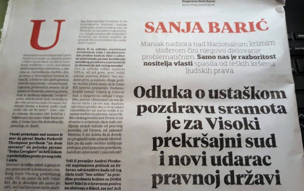 Intervju Večernjem listu objavljenom u Obzoru 6.lipnja 2020.godine, ustavno pravna stručnjakinja i predstojnica Katedre za ustavno pravo u Rijeci Dr Sanja Barić iznijela je svoje stavove u svezi Pjesme Čavoglave i pozdrava Za dom spremni: