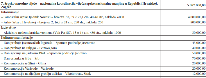 Iz Državnog proračuna Republike Hrvatske u 2022. godini, financijska sredstva u iznosu od 50.204.225,00 kuna namijenjena su nacionalnim manjinama po Ustavnom zakonu o pravima nacionalnih manjina. Od tih sredstava Srbima je namijenjeno 13.603.000,00 kuna. NN 48/2022
