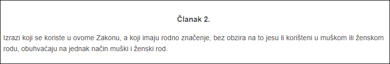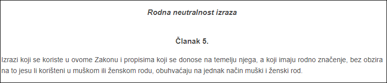 - Zakon o zaštiti od nasilja u obitelji ( NN 70/17) koji izričito štiti žene i djecu od oblika fizičkog, psihičkog, psihološkog i oblika egzistencijalno ugrožavajućeg nasilja u kojem također nema pojma roda,