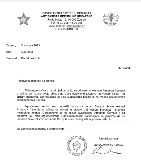 Ispriku je uredništvo portala sabh.hr uputilo samo meni osobno, sa obvezom da se citiram“ ubuduće takvi tekstovi Armanda Černjula neće objavljivati na portalu sabh.hr“ Međutim vidim da je njihovo jamstvo kratko trajalo i da je novi tekst A.Č. na portalu sabh.hr 11.svibnja uz ogradu uredništva osvanuo.