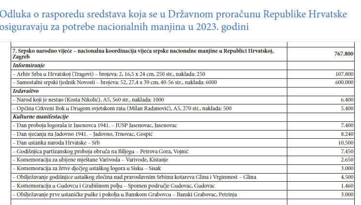 Za 2023.godinu Srpska nacionalna manjina dobila je ukupno 2 059 000 eura. Od toga je Srpsko kulturno društvo »Prosvjeta«, Zagreb, dobilo 932.600 eura, Srpsko privredno društvo »Privrednik«, Zagreb , 64.000 eura, SNV je dobilo 767 800 eura, a Zajedničko vijeće općina Vukovar dobilo je 188 000 eura, Dio sredstava SNV-a, 600 000 eura namijenjeno je financiranju tjednika Novosti, dok je 107 800 eura, namijenjeno Arhivu Srba u Hrvatskoj. Tu su još 11.800 eura, za izdavanje knjiga, kao i novac za brojne komemoracije iz 2.svjetskog rata, te manja društva iz Tenje, Ostrova, Kneževih Vinograda, Dalja, Borova i Silaša.