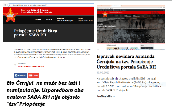 I ne samo što se uredništvo portala sabh.hr javno ispričalo, već smo se bez suda i tužbe dogovorili i riješili problem , koji je nastao kada su pristali objaviti tzv ispravak Armanda Černjula, na njihovu ispriku. Armandu Černjulu novinaru iz Pule otkazali su suradnju tako da takve tekstove neće više objavljivati.