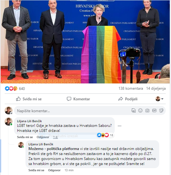 Ne poštujući simbole države koju mi „ desničari“ držimo i volimo kao svoju domovinu LGBT vrši teror, agresivno nametanje LGBT načina života, sa svojim zastavama koje su PROTUUSTAVNE! Po kojim se to kriterijima zastave duginih boja mogu vijoriti, a Ustavni simboli ne mogu? Njih treba prekriti! Zar LGBT populacija drži da su oni iznad Ustava RH ?