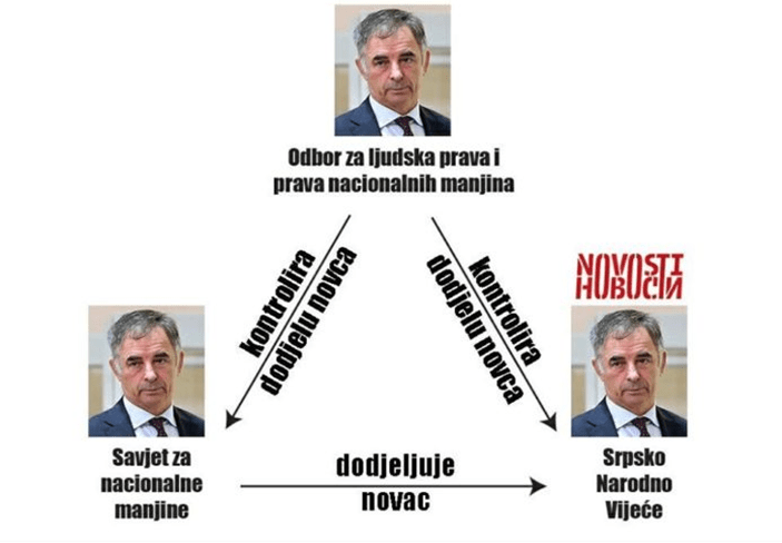 Međutim Milorad Pupovac privatno je predsjednik Srpskog Narodnog vijeća (SNV), a kao dužnosnik je zastupnik u Saboru i Saborskom odboru za ljudska prava i prava nacionalnih manjina i član Savjeta za nacionalne manjine, koji donosi odluku o raspodjeli sredstava SNV-u kojem je predsjednik.