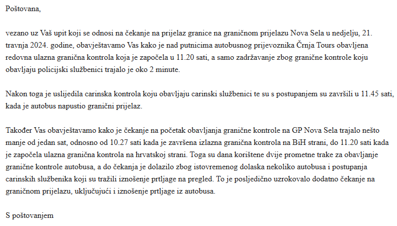 Dakle potvrđeno je da smo čekali, ali nešto umanjeno s njihove strane. Čekanje od 2 minute ne trebam ni komentirati, jer nas je bilo 50-tak u autobusu pa samo za pogledati osobne iskaznice treba puno više vremena.
