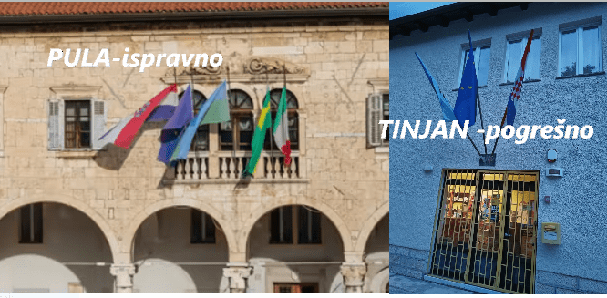 „ Člankom 18. Pravilnika o postupku davanja odobrenja grba i zastave jedinici lokalne samouprave propisano je i postavljanje drugih zastava uz onu Republike Hrvatske, a uvijek gledano s ulice prema zastavama. Pod ‘drugim zastavama’ mislimo na one županije, grada i/ili općine. Tako se zastava JLS-a (jedinica lokalne samouprave) ističe uz zastavu Republike Hrvatske s desne strane“