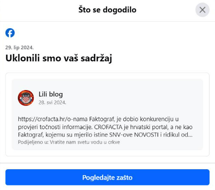 Nekorektno ste sa pozicija moći skinuli moje objave o portalu Crofacta i to javnost treba znati. CroFacta je novi portal koji je Leksikografski zavod osmislio u suradnji s Hrvatskim institutom za povijest i Hrvatskim memorijalno-dokumentacijskim centrom Domovinskog rata i uz potporu Agencije za elektroničke medije!