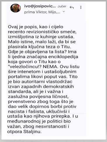 Kaže g. Josipović u mail raspravi da je Tito „ važna i zaslužna povijesna ličnost“