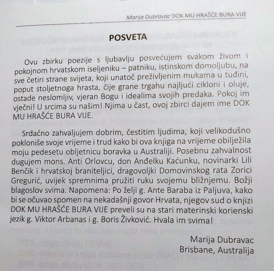 Dobro došli u ovaj dan kada se i sunce pojavilo da oda počast našoj dragoj pjesnikinji Mariji Dubravac. Rođenoj davne 1949. godine u Štitaru i koja je ne svojom voljom morala napustiti lijepu našu domovinu. Cijeli život ju je nosilu u svom srcu i zavapila na kraju svog života „ Vratite me kući“