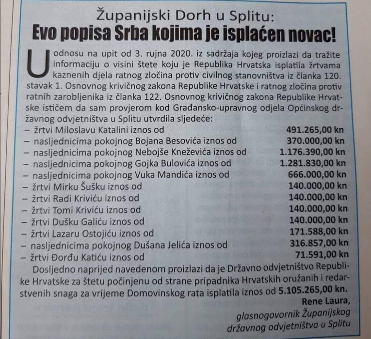 Postavlja se pitanje hrvatskom političkom vrhu, Vladi RH i hrvatskom Pravosuđu zašto 33 godine od počinjenja prvih zločina nad hrvatskim braniteljima i civilima oni i njihove obitelji još čekaju na naknadu štete od Srbije koja im nedvojbeno pripada, a za srpske civile hrvatsko pravosuđe presuđuje odštetu? Gdje je tu pravda za hrvatske žrtve velikosrpske agresije?