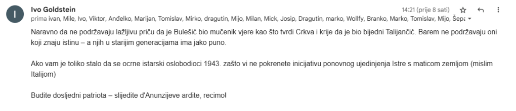 Evo ovaj citat je čisti YU AGITPROP, kao da slušam partijske komesare 50-60 godina prošlog stoljeća. Pozivanjem na Ivu Goldsteina, kvazi povjesničara, koji piše neistine da je Bl. Miroslav Bulešić bio „bijedan Talijančić“ i negira zasluge istarskog svećenstva za pripojenje Istre Hrvatskoj, a uz to izmišlja drobilice kostiju da potvrdi svoje tvrdnje , jasno ukazuje na manipulaciju.