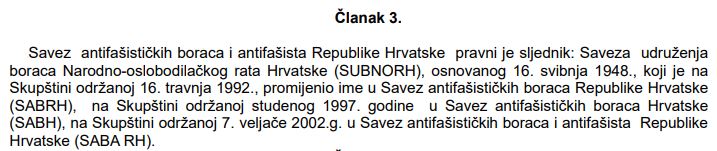 „…pravni je sljednik: Saveza udruženja boraca Narodno-oslobodilačkog rata Hrvatske (SUBNORH), osnovanog 16. svibnja 1948., koji je na Skupštini održanoj 16. travnja 1992., promijenio ime u Savez antifašističkih boraca Republike Hrvatske