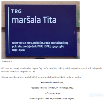 SABA RH  pa do kada ? Dosta naturanja propale države i propale ideologije. 30 godina nema Jugoslavije. Ovo je Hrvatska! Sutra će se  SABA RH  predvidivo,  zbog  jedino moguće i  ispravne odluke  o odbijanju imenovanja Trga maršala Tita, obrušiti na vladajuće i  strašiti  kao malu djecu „baba rogom“,  sa porastom fašizacije, ustašizacije, klerofašizmom i sličnim … More Pa dosta više  Tita ?  Nazivati trgove, ulice, obale i parkove imenom  Maršala Tita nema ustavne, ni zakonske osnove  u Republici Hrvatskoj